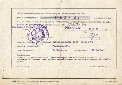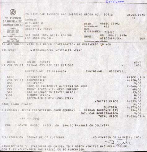 Here are a few of the documents I got with Daisy. She was a "Tourist Delivery Vehicle", meaning she was picked up at the factory in Wolfsburg, Germany.