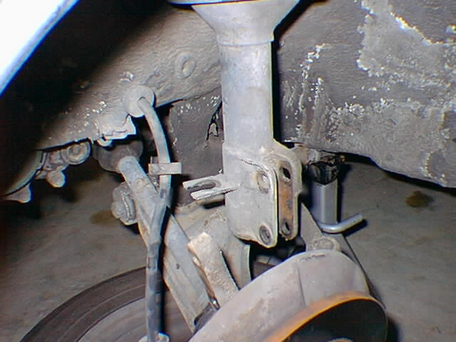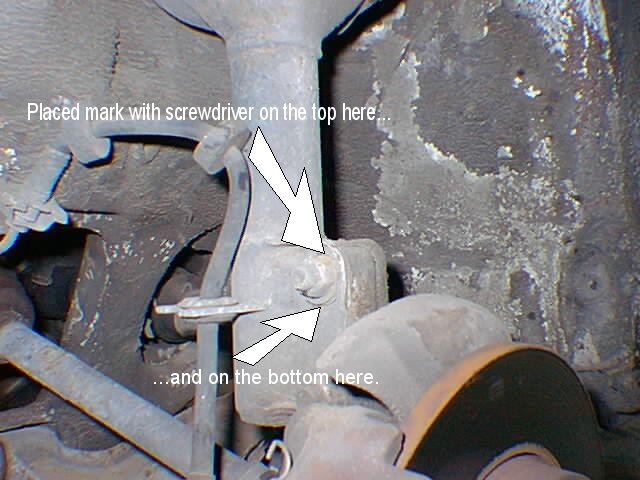 Next, I used the screwdriver to mark the lower part of the strut where the eccentric bolt and washer were located so I could put them back in the same place. I "outlined" them. See photo: