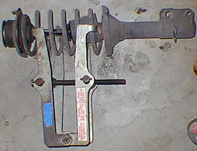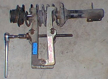 Now came the tricky part: compressing the spring to allow removal of the strut bearing. Using the spring compressor was tough at times. I got the compressor aligned as close as I could to be at the middle of the spring. See below: