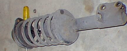 Before I removed the strut, I marked the top of the strut bearings so I would put them back in the car the same way they came out. I don't think that it matters greatly, but I don't think that it would hurt. I scratched an arrow on the bearings pointing to the front of the car. Next, I removed the two 13mm bolts from the inside of the engine compartment that hold the struts to the body. With those removed, the strut is free to be removed from the car. Here's the complete strut assembly after removal:
