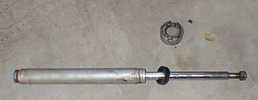 To remove the bearing, I used the 22mm offset wrench and the crescent wrench to loosen the locknut on the insert. The cresent wrench held the top of the strut insert while the 22mm wrench loosened the locknut. Once the locknut was removed, I removed the bearing, making note of the placement of all the pieces, ensuring they would be installed in the proper order. I then removed the spring from the rest of the strut. There is a large nut on the strut housing, holding the insert in. To remove this nut, I put the strut in a vise and put a pipe wrench around the nut. The nut was on so tight, I had to use a three foot cheater pipe on the wrench and have a friend tap on the nut with a chisel to get it to move. The new inserts came with a new nut, so I wasn't too concerned about any damage to the nut. Here's the old insert that's been removed, and the large nut that secured it in place: